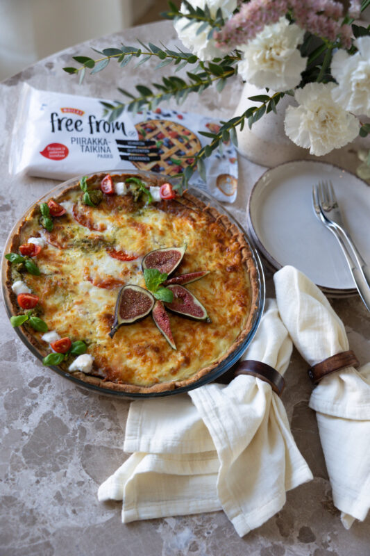 Voit halutessasi koristella jäähtyneen piirakan esimerkiksi kirsikkatomaateilla, mozzarella ja basilikanlehdillä tai tuoreella viikunalla.
