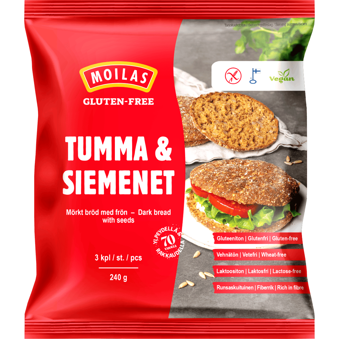 Tattari (jauho, rouhe, raskijauhe), vesi, siemenet 14 % [auringonkukka (EU), pellava (Suomi)], riisi (raskijauhe, täysjyväjauho, jauho), psyllium, bambukuitu, perunakuitu, melassi, rapsiöljy, suola, karamellisiirappi, hiiva. Saattaa sisältää pieniä määriä gluteenitonta kauraa.
